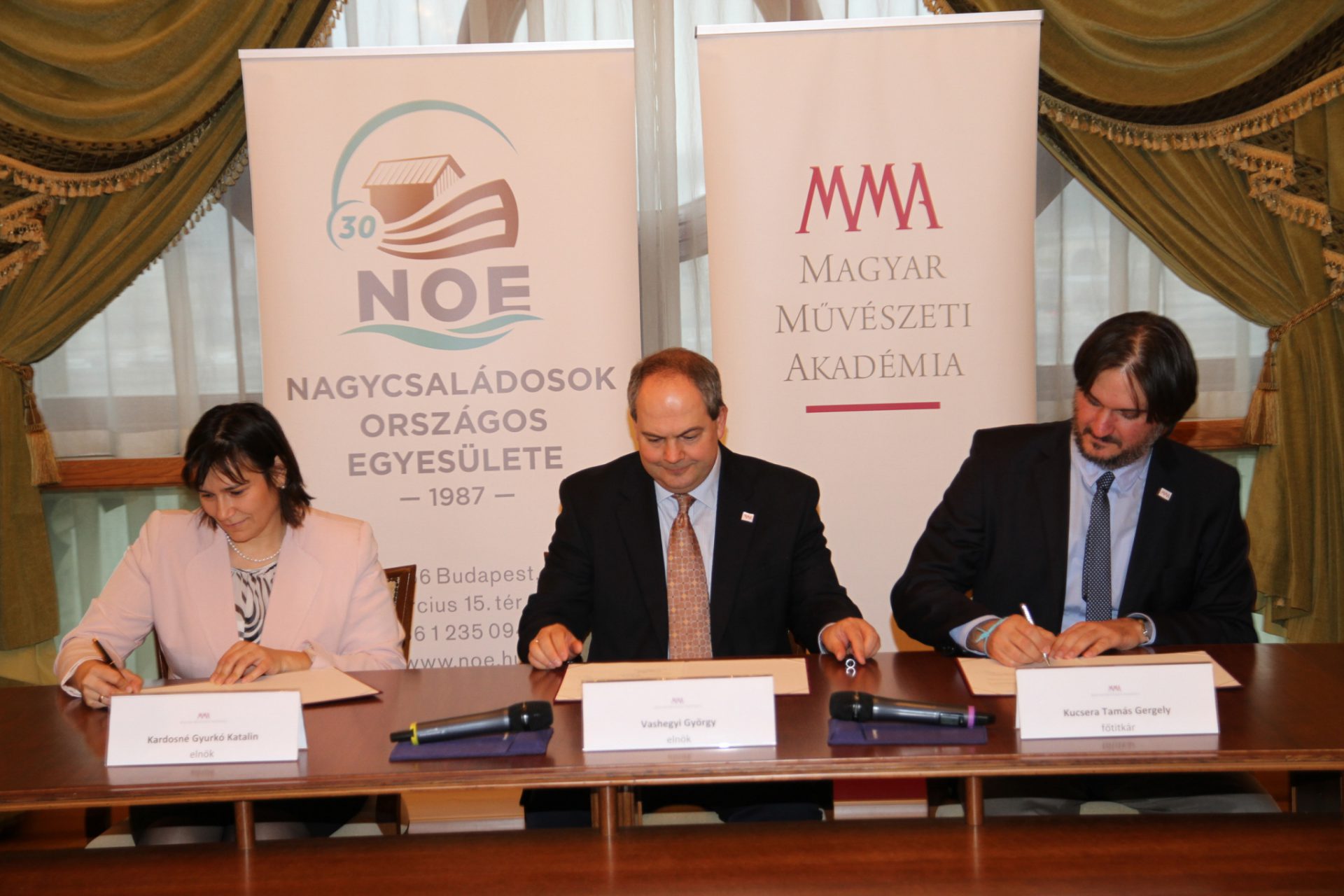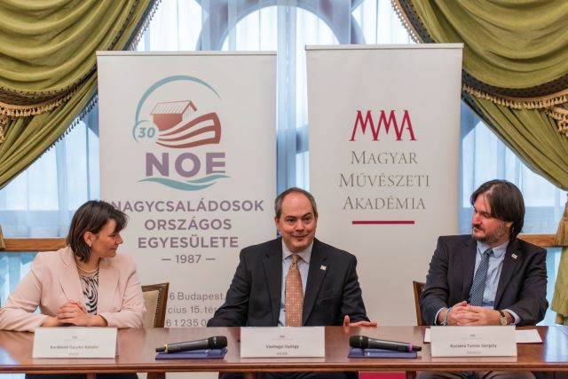 Stratégiai együttműködési megállapodást írt alá a Magyar Művészeti Akadémia (MMA) és a Nagycsaládosok Országos Egyesülete (NOE) csütörtökön az MMA székházában, a Pesti Vigadóban. Az MMA részéről Vashegyi György elnök és dr. Kucsera Tamás gergely főtitkár, a NOE részéről Kardosné Gyurkó Katalin elnök látta el kézjegyével a megállapodást. A NOE tagsági kártyával rendelkezők a jövőben kedvezményes belépésre jogosultak az MMA intézményeiben (Pesti Vigadó, Műcsarnok) rendezett kiállításokra, egyéni vagy szervezett csoportos látogatásokra.