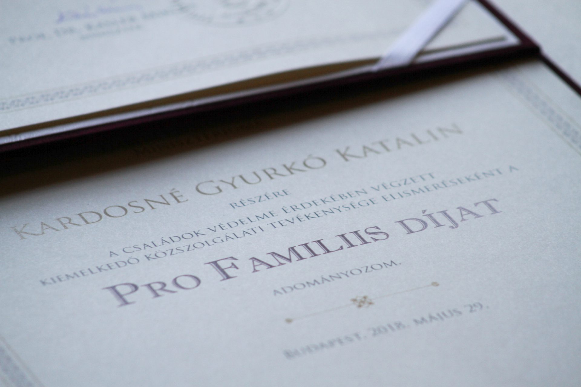 2018. május 29-én a családokért végzett szakmai munkájáért ProFamilliis díjban részesült Kardosné Gyurkó Katalin, a NOE elnök asszonya. Ezúton is gratulálunk! Az elismerést Kásler Miklós, az Emberi Erőforrások Minisztériumának minisztere adományozta, Novák Katalin adta át a díjazottaknak: Anna Záborskának, dr. Görög Norbertnek, Haraszti Ákosnak és Haraszti Ákosnénak, Kardosné Gyurkó Katalinnak, Kató Bélának, Léder Lászlónak, Regős Juditnak, Sohajda Leventének és Sohajdáné Samu Zsuzsannának, Vida Zsoltnak, illetve Vukovich Gabriellának.