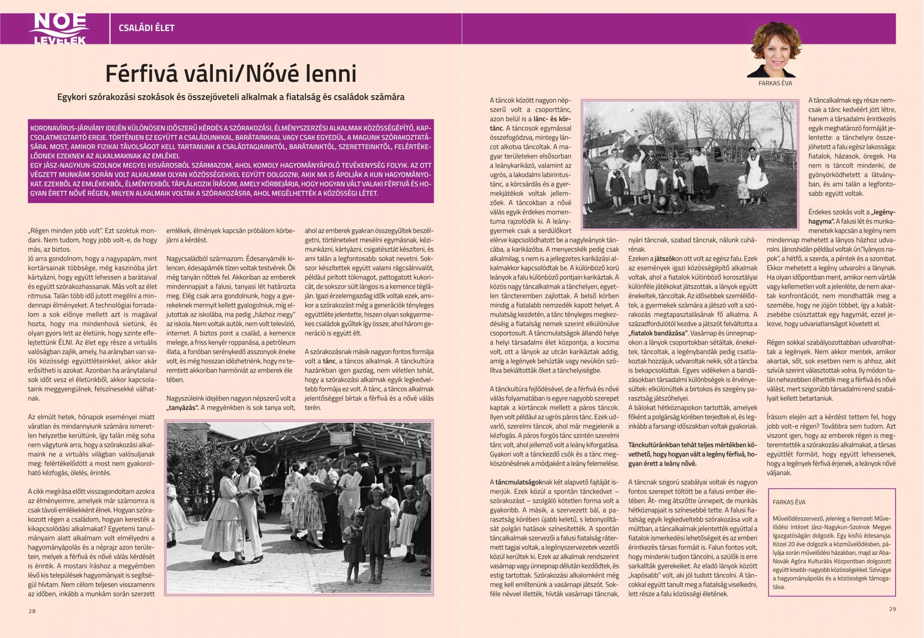 A cikk megírása előtt visszagondoltam azokra az élményeimre, amelyek már számomra is csak távoli emlékekként élnek. Hogyan szórakozott régen a családom, hogyan keresték a kikapcsolódási alkalmakat? Egyetemi tanulmányaim alatt alkalmam volt elmélyedni a hagyományápolás és a néprajz azon területein, melyek a férfivá és nővé válás kérdését is érintik. A mostani íráshoz a megyémben lévő kis települések hagyományait is segítségül hívtam. Nem célom teljesen visszamenni az időben, inkább a munkám során szerzett emlékek, élmények kapcsán próbálom körbejárni a kérdést.