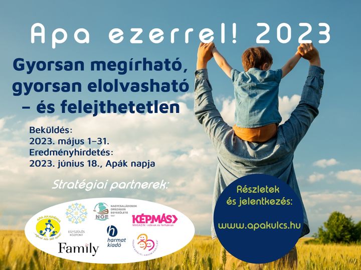 2023 májusában várjuk a frappáns, emlékezetes, szívmelengető, örömteli vagy épp szívszorító; apával, apasággal kapcsolatos történeteket. Ami ma is eszedbe jut. Ami épp most esett meg veled. Amit sosem fogsz elfelejteni. Ami apáról megmaradt. Amiből érzed, hogy apa vagy. Amit más apától láttál. Amit átéltél. Amit átélnél. Ami lelkesít. Ami elszomorít. Ami éltet – és ami maga az élet.