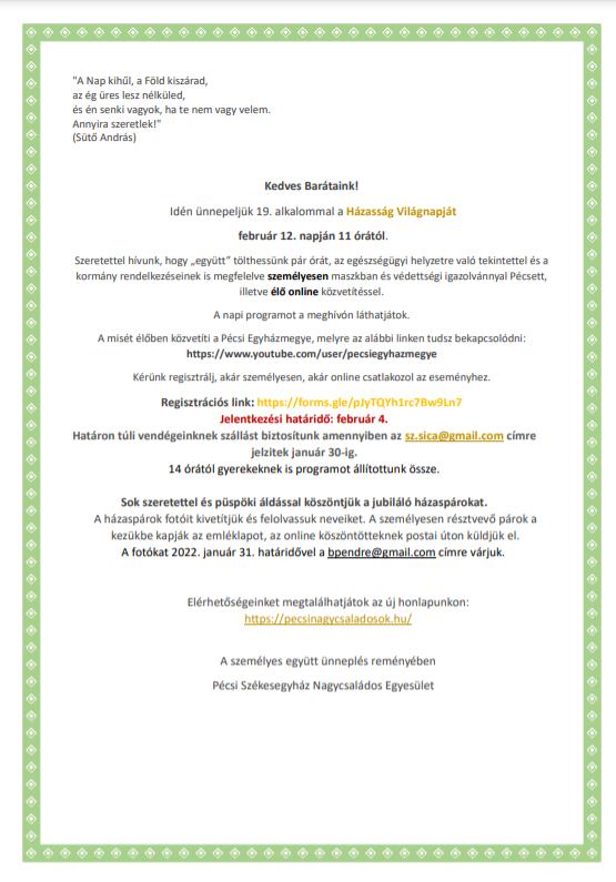 Sok szeretettel és püspöki áldással köszöntjük a jubiláló házaspárokat. A házaspárok fotóit kivetítjük és felolvassuk neveiket. A személyesen résztvevő párok a kezükbe kapják az emléklapot, az online köszöntötteknek postai úton küldjük el. A fotókat 2022. január 31. határidővel a bpendre@gmail.com címre várjuk.