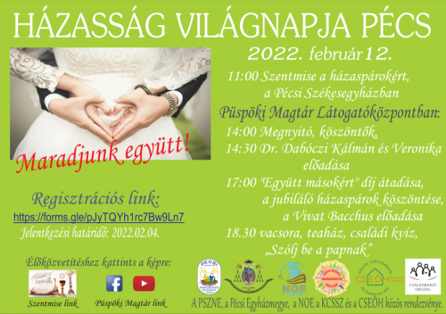Idén február 12-én, szombaton tartjuk a Pécsi Székesegyház Nagycsaládos Egyesület szervezésében a Házasság Világnapi rendezvényünket, melyet 19. alkalommal ünneplünk közösen.
