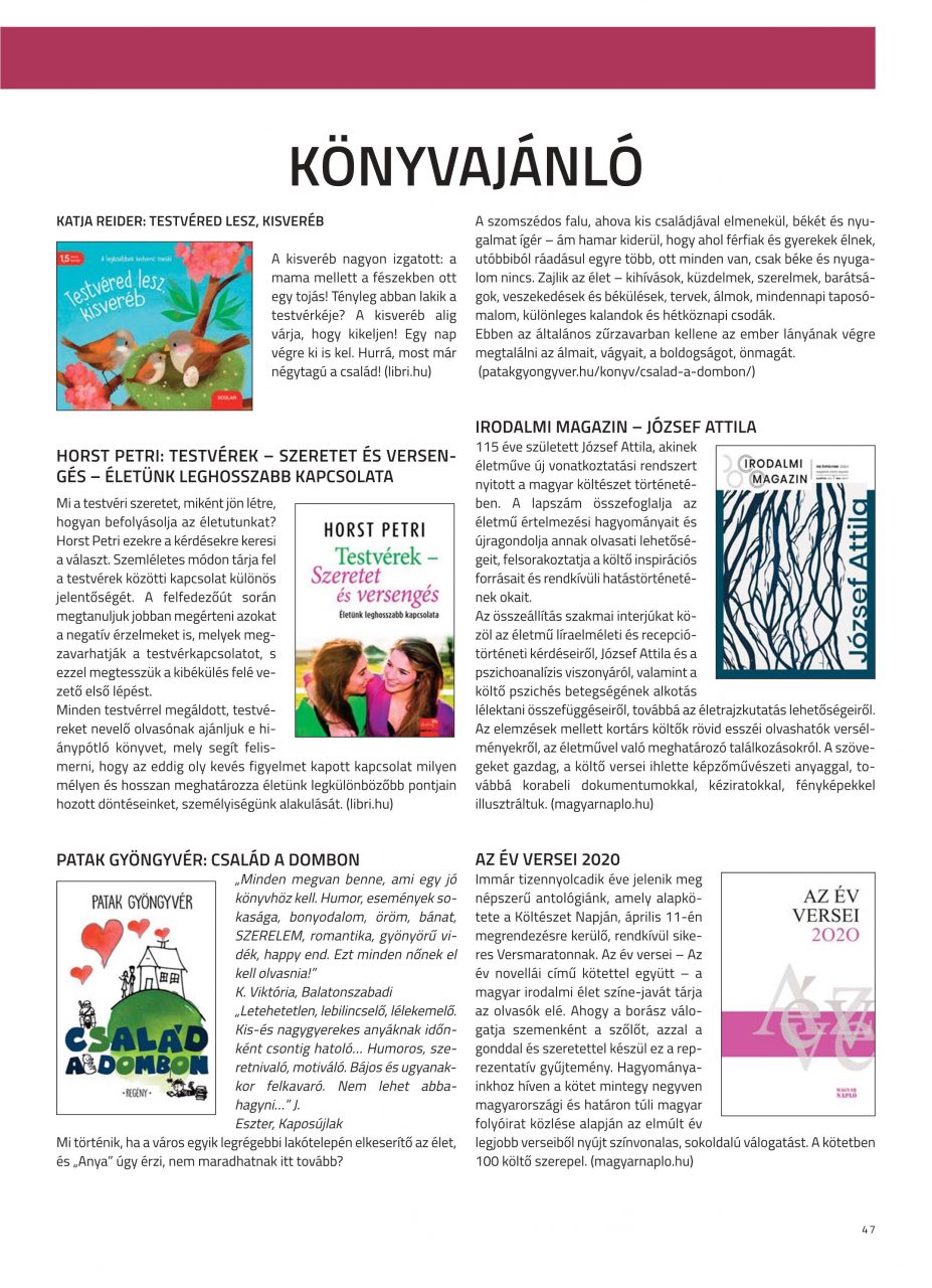 Ha sorra vesszük, hogy mire érdemes időt szánnunk, ha ki akarunk kapcsolódni, ha meg akarjuk őrizni szellemi frissességünket, s talán ép eszünket, s mivel is töltsük azt a bizonyos én.időt, akkor az olvasás a könyvek a legjobb választás. Az Irodalmi Magazin József Attila-számát, Az év versei 2020 antológiát és három, testvérekről szóló könyvet ajánlunk a NOE Levelek magazin májusi számából.