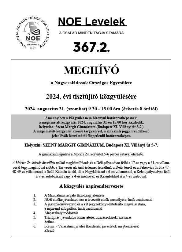 Minden tagcsaládot szeretettel hívnak a közgyűlésre a Jelölő Bizottság tagjai: