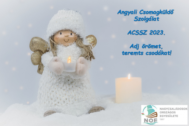 JÓTÉKONYSÁGI FELHÍVÁS A Nagycsaládosok Országos Egyesülete ebben az évben is elindítja Angyali Csomagküldő Szolgálatát (ACSSZ-t). 2006 óta, amikor először indult útjára ez a jótékonysági programunk, sok ezer család ünnepét sikerült megkönnyíteni. Angyalaink sok rászoruló NOE családot örvendeztetnek meg évről évre …