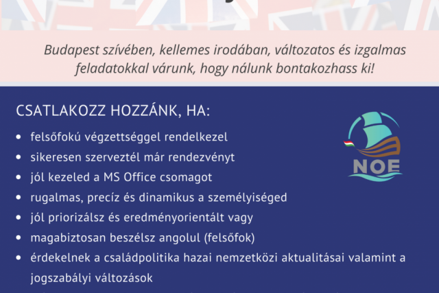 ÉRDEKVÉDELEM ÉS NEMZETKÖZI KAPCSOLATOK TERÜLETÉN KERESSÜK CSAPATUNK LEGÚJABB TAGJÁT Budapest szívében, kellemes irodában, változatos és izgalmas feladatokkal várunk, hogy nálunk bontakozhass ki! CSATLAKOZZ HOZZÁNK, HA: felsőfokú végzettséggel rendelkezel sikeresen szerveztél már rendezvényt jól kezeled a MS Office csomagot rugalmas, precíz …