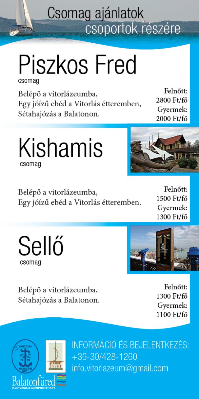 Ízelítő a látnivalók közül: Vaszary Galéria, Jókai Mór Emlékház, Helytörténeti Gyűjtemény, Bodorka Látogatóközpont, Kisfaludy Galéria. Lehetséges kombinált jegycsomagok vásárlása is, melyet így még kedvezőbb áron vásárolhattok meg. Kiemelnénk a Vitorlázeumot, ami egyedülálló vitorlástörténeti játékos és interaktív kiállítótér, mely bemutatja a balatoni vitorlássportot, a nagyhírű hajók, hajósinasok történetét is. Figyelmetekbe ajánljuk a kombinált csomagok mellett a „Piszkos Fred”, a „Kishamis”, a „Sellő” csomagokat, mellyel a Vitorlázeum mellett kaphattok egy finom ebéd és/vagy hajózhattok a Balatonon. Az említett csomagok, jegyek árait mellékelve találhatjátok, érdeklődni, jelentkezni a vaszary.kozonsegszervezes@gmail.com e-mail címen tudtok.