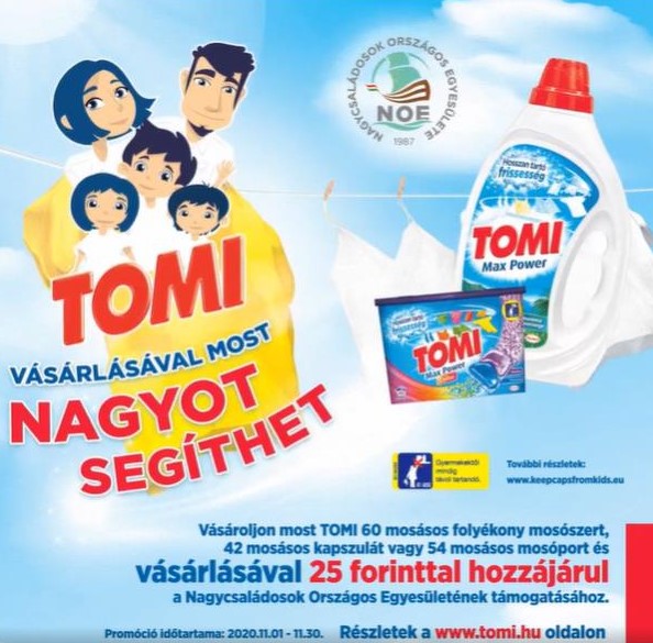 Vásároljon most Tomi 60 mosásos folyékony mosószert, 54 mosásos mosóport vagy 42 mosásos kapszulát, és vásárlásával 25 Ft-tal hozzájárul a Nagycsaládosok Országos Egyesületének támogatásához!