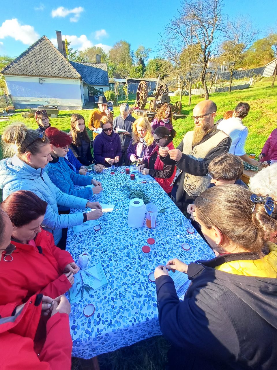 Izgalmas, jó hangulatú napot tölthettünk el november 4-én az Ürmös porta pannonhalmi birtokán. A reggeli négy fok tíz órára már 12-re szelídült és a nap mellett a finom gyógynövényes teák is kellemesen melengették a régió minden pontjáról érkező résztvevőket. Miután megismerkedtünk a hely és tulajdonosa, dr. Pottyondy Ákos történetével, a délelőtt a gyógynövényekről, azok termesztéséről és felhasználásáról szólt, de a talajegészség fontossága, a mulcsolás és takarás különbsége a biodinamika és még sok más is szóba került. Az ebédszünetben megosztottuk kis batyuink tartalmát, beszélgettünk, ismerkedtünk, majd gyümölcsészettel folytattuk. Megtudtuk, miért jó tájfajtákat ültetni, hogyan történik az oltás és a metszés, ha egyáltalán szükség van rá.