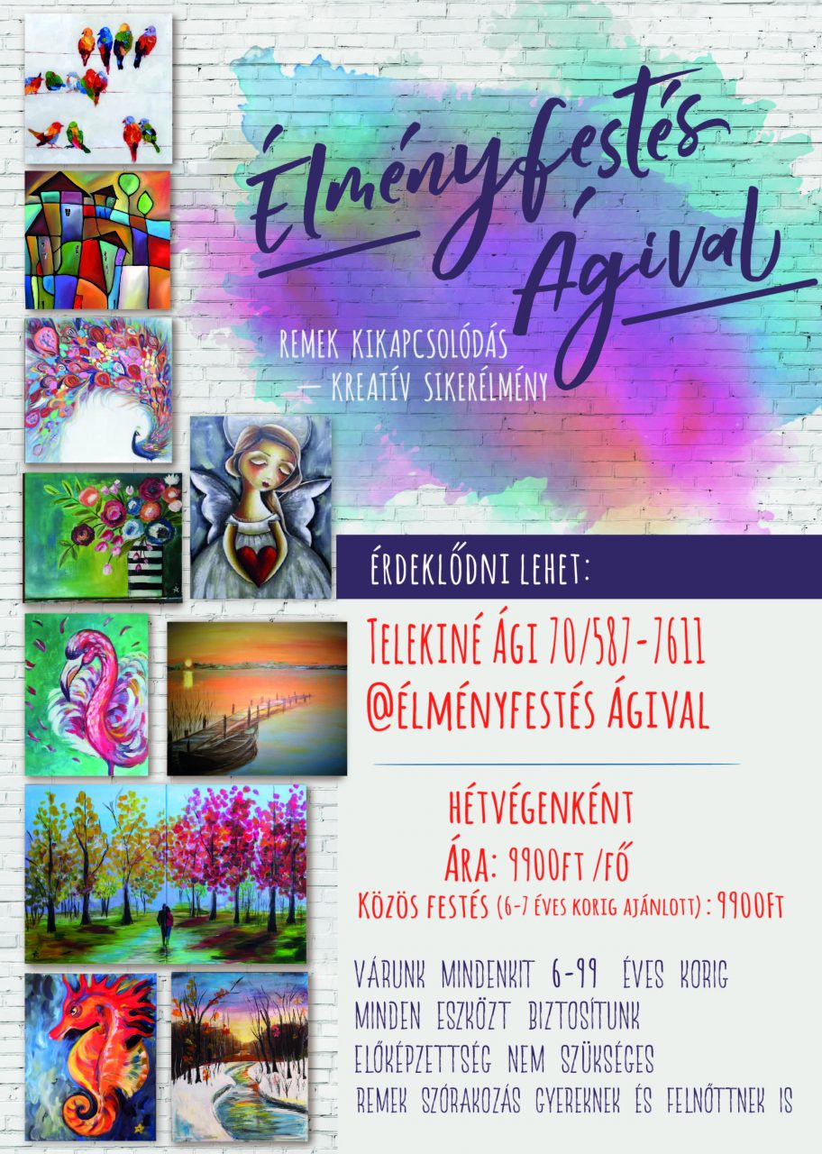 Az élményfestés egy kreatív és vidám időtöltés, ami lehet 3 órányi feltöltődés, énidő, de lehet családi, szülő-gyerek, vagy éppen páros foglalkozás is. Készíts egy képet lépésről-lépésre saját magadnak vagy ajándékba! A részvételhez semmilyen előképzettség nem szükséges, Ági minden eszközt biztosít. Ajánlott életkor: 14 és 99 év között.