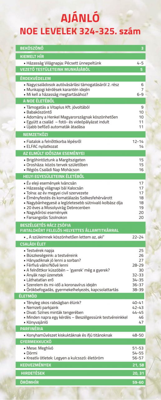 Ez az a lapszámunk, amely mindenkit otthon talál ebben a járvány-helyzetben, a testvéreket éppúgy, ahogy az édesanyákat. Épp ők a főszereplői az írásoknak, hiszen májusban ünnepeljük az édesanyákat, s a testvérek napját. Szóba kerül, hogy ki miért büszke a testvérére, hányadiknak lenni jó a sorban, ahogy az is, hogy mit tehet a szülő, ha már a felnőttkor kopogtat a gyermek ajtaján. A Rácz Zsófia, fiatalokért felelős helyettes államtitkárral készült interjúban a szülők szerepéről is olvashattok a felnőtté válás és a pályaválasztás kapcsán. Nem feledkezünk meg a nehezebb kérdésekről sem, hiszen csoportvezető bíró ad részletes tájékoztatást a testvérek jogai kapcsán a gyermekelhelyezés, a kapcsolattartás és az örökbefogadás bírósági kezeléséről. A bezártság új helyzetet teremt a szülők közti kapcsolatokban is, így érdemes beszélni a szerelemről, a párkapcsolatról, a mi-időről, de a láthatatlan munka is új megvilágításba kerülhet. Az okostelefonok okozta függőség kezeléséről is szó esik, hiszen a négy fal között ennek szerepe is változik. De nem hagyjuk cserben azokat sem, akik keresik a kirándulási lehetőségeket, a szép ruhák és a kreatív ötletek, a jó receptek szerelmeseinek is bőven kínálunk olvasnivalót. És mindemellett megtudhatjátok mi történt a többi egyesület és a NOE életében, ahogy a nemzetközi munkánkba is bepillantást nyerhettek, s nem marad el a mese és a gyermeksarok játékai sem.