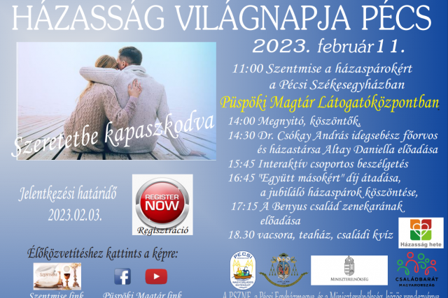 A Pécsi Székesegyház Nagycsaládos Egyesület idén is megrendezi a Házasság Világnapja alkalmából tartandó rendezvényét, melyre szeretettel várják a jelentkezőket. Regisztráció határideje: 2023. február 3. péntek éjfél Regisztráció Plakát (letölthető) Program (letölthető)